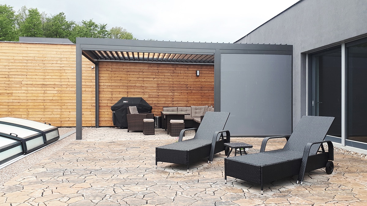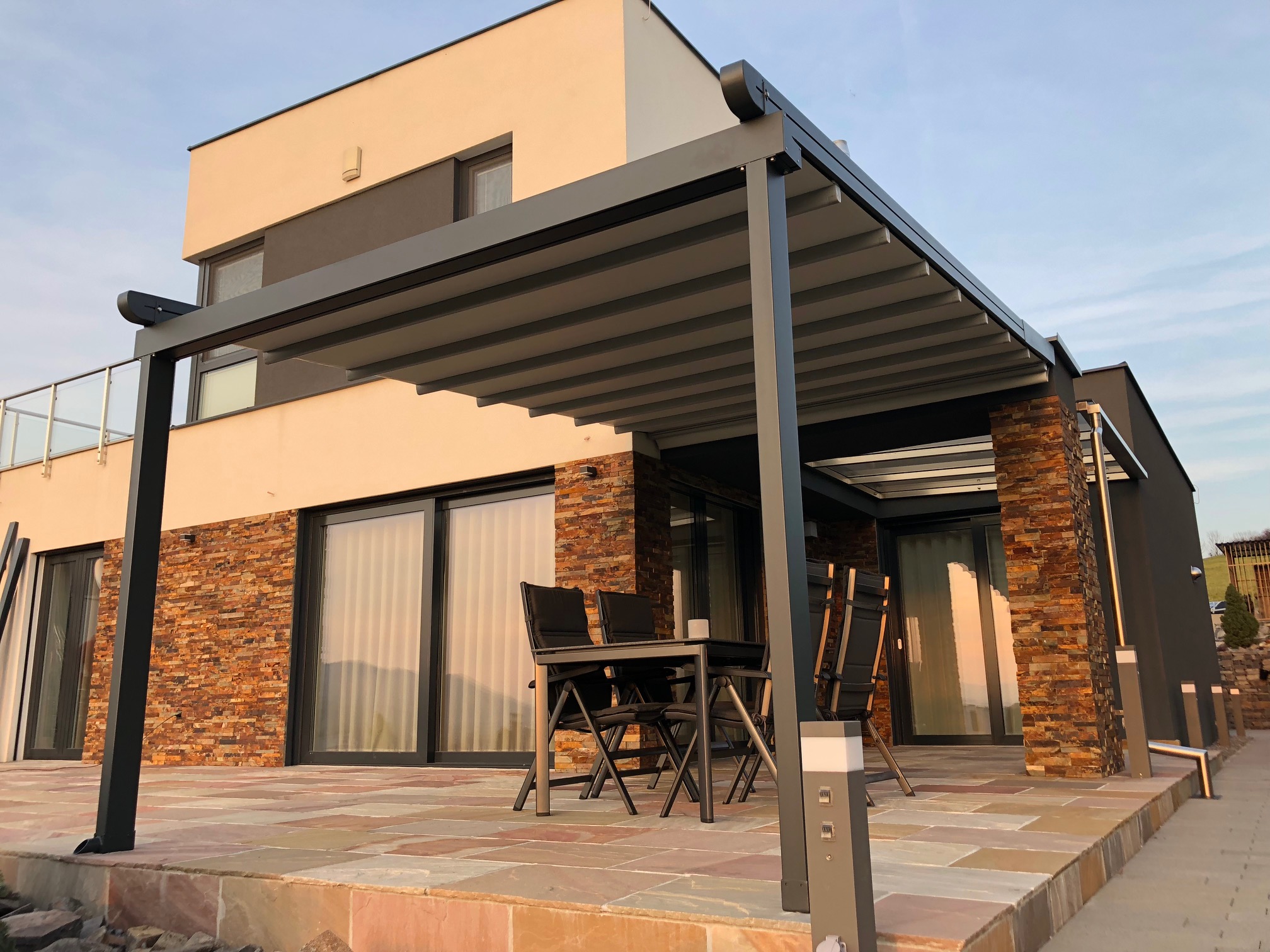 V konštrukcii pergoly je integrovaný žľab aj zvod na dažďovú vodu. Plachtová strecha je veľmi jednoducho čistiteľná tlakovou vodou, je vyrobená z trojvrstvového Blackout PVC – “Polyplan Pergola Opaque” od výrobcu Sattler, ktorá neprepúšťa svetlo, je 100% nepremokavá, UV stabilná a odolná voči plesniam (gramáž 760 g/m2, pevnosť v ťahu 2500N/50mm).